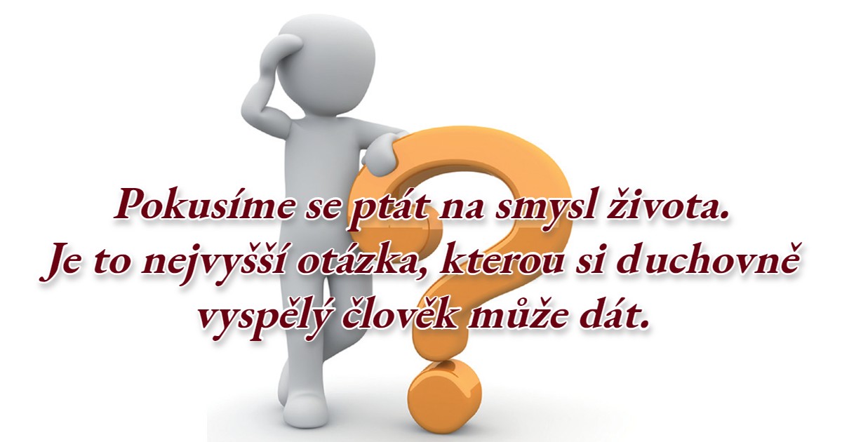 Pokusíme se ptát na smysl života. Je to nejvyšší otázka, kterou si duchovně vyspělý člověk může dát. Ve vývojové řadě živočišných druhů je to totiž teprve člověk, který si ji může položit, uvažovat o ní a pátrat ve své poměrné duchovní schopnosti po poměrně hlubokém pochopení.