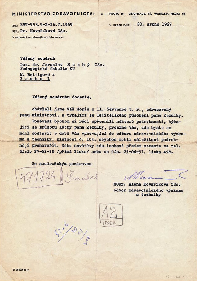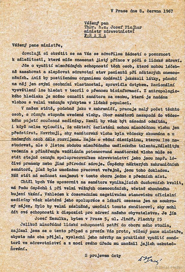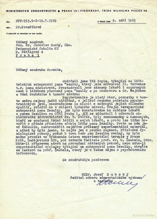 obdrželi jsme Váš dopis, týkající se léčitelských schopností pana Zezulky, který jste adresoval 11. července t. r. panu ministrovi. Prostudovali jsme záznamy lékařů i soukromých osob o léčebném působení pana Zezulky a po rozhovoru s dr. Rejdákem a Vámi docházíme k tomuto závěru: