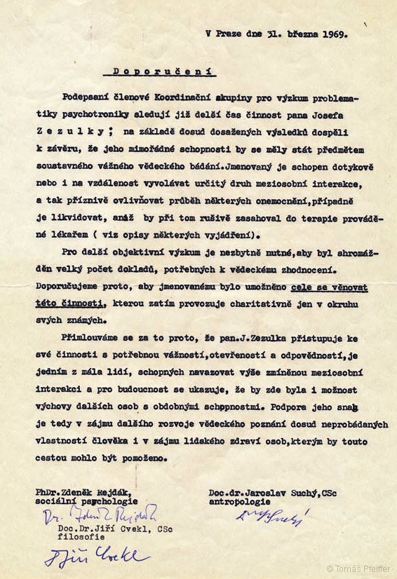 Podepsaní členové Koordinační skupiny pro výzkum problematiky psychotroniky sledují již delší čas činnost pana Josefa Zezulky; na základě dosud dosažených výsledků dospěli k závěru, že jeho mimořádné schopnosti by se měly stát předmětem soustavného vážného vědeckého bádání. Jmenovaný je schopen dotykově nebo i na vzdálenost vyvolávat určitý druh meziosobní interakce, a tak příznivě ovlivňovat průběh některých onemocnění, případně je likvidovat, aniž by při tom rušivě zasahoval do terapie prováděné lékařem (viz opisy některých vyjádření).
