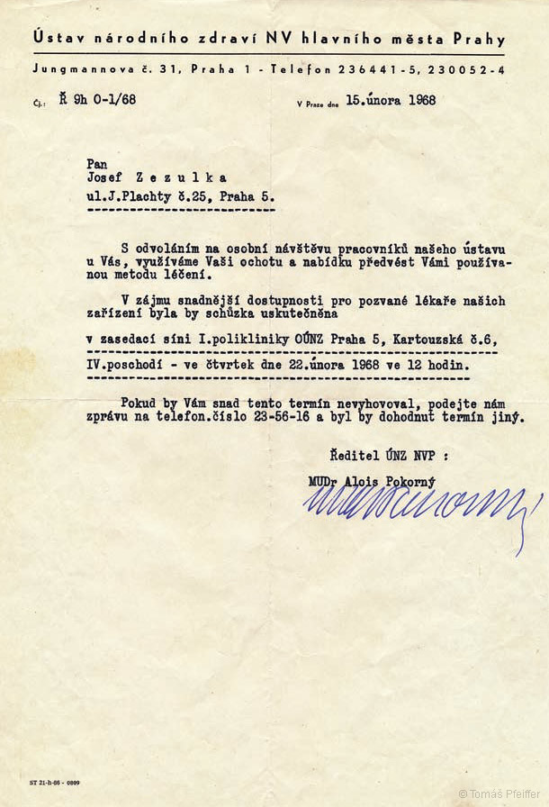 Poněvadž bychom si rádi upřesnili některé podrobnosti, týkající se způsobu léčby pana Zezulky, prosím Vás, zda byste se mohl dostavit v době Vám vyhovující do odboru zdravotnického výzkumu a techniky, místnost č. 104, bychom mohli záležitost podrobněji prohovořit. Dobu návštěvy nám laskavě předem oznamte na tel. číslo 25-62-28 (přímá linka) nebo na čís. 25-06-51, linka 498.