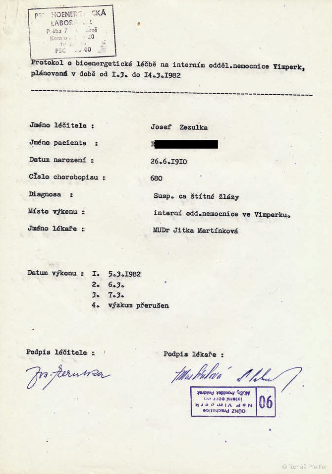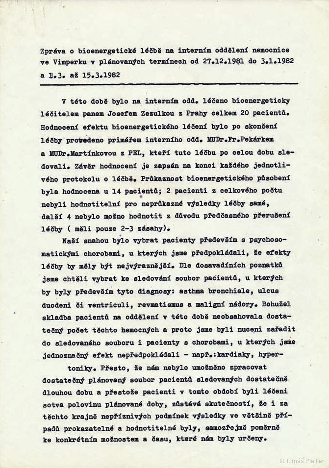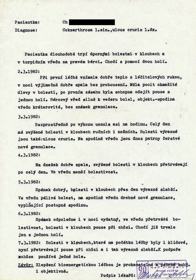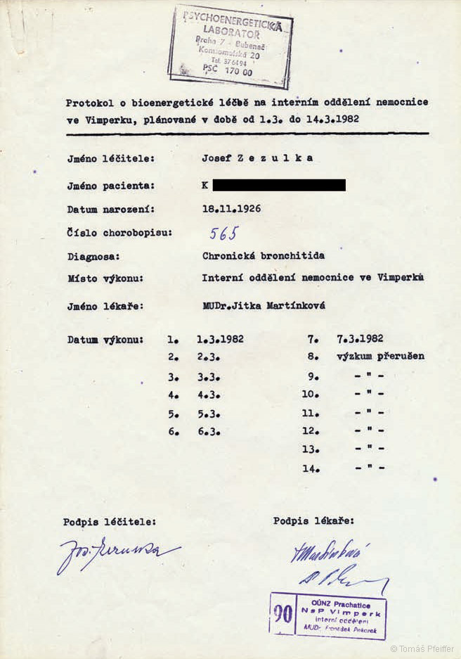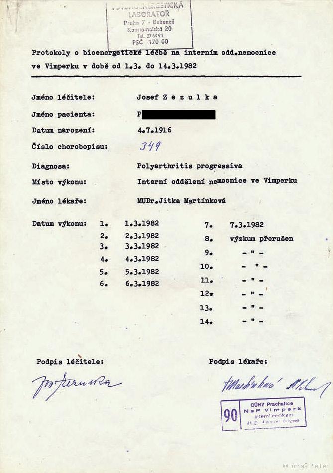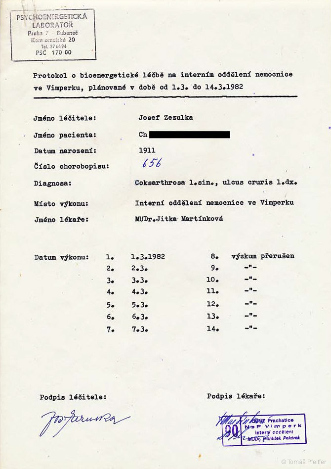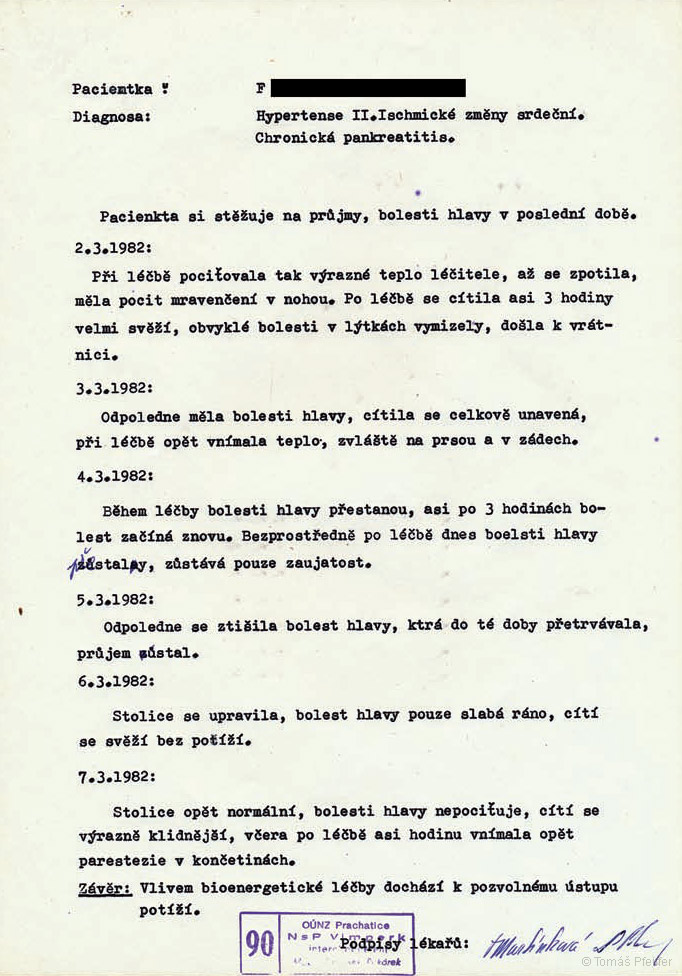 Zvláště na jednoho pacienta léčeného panem J. Z. se sjížděli podívat lékaři z okolí, dokonce i porodníci. A bylo proč. Jak uvidíte ze zápisu, pořízeného tehdy a podepsaného lékařem vimperské nemocnice MUDr. Pekárkem a MUDr. Martínkovou za psychoenergetickou laboratoř, která výzkum z osobního pověření profesorem Kahudou vedla.