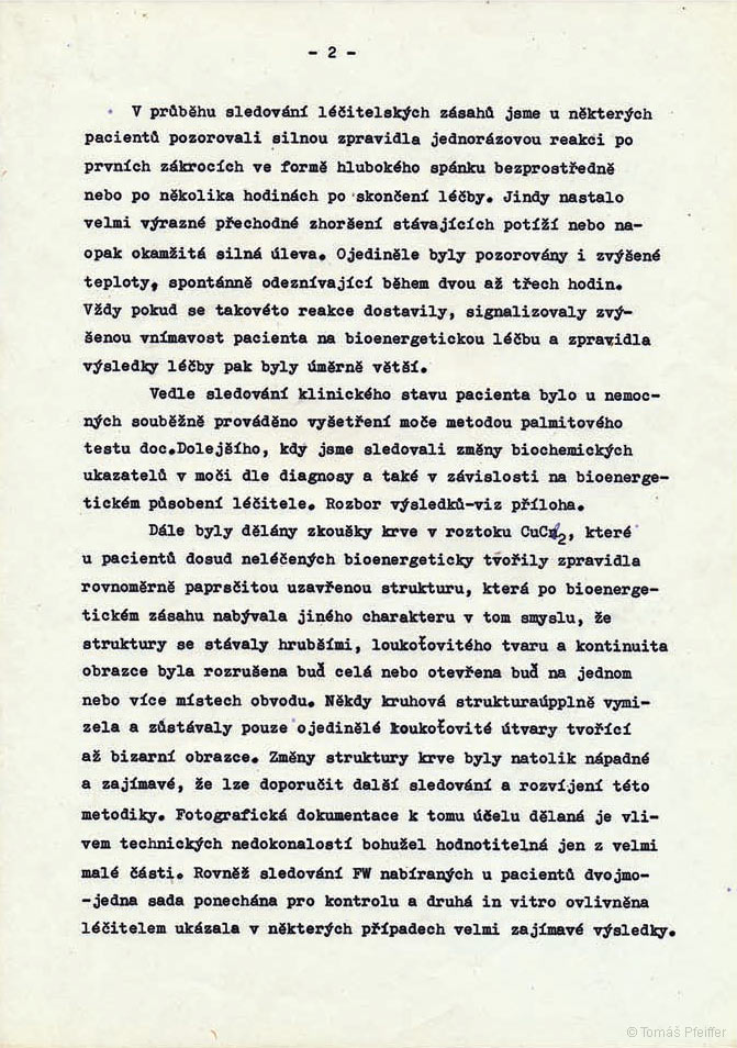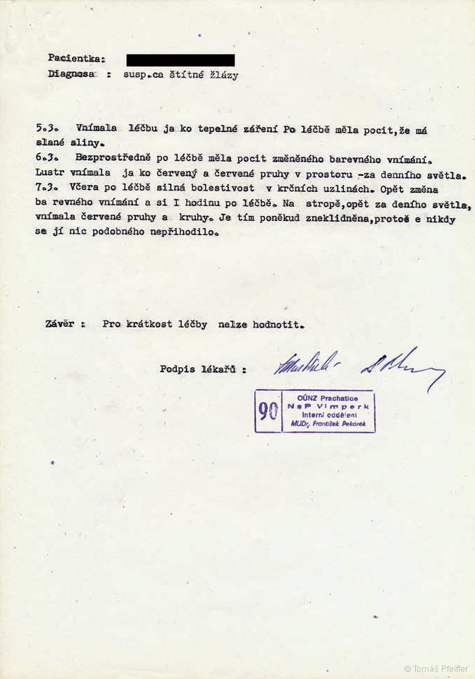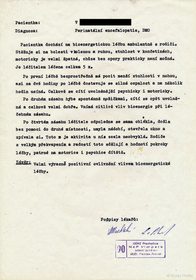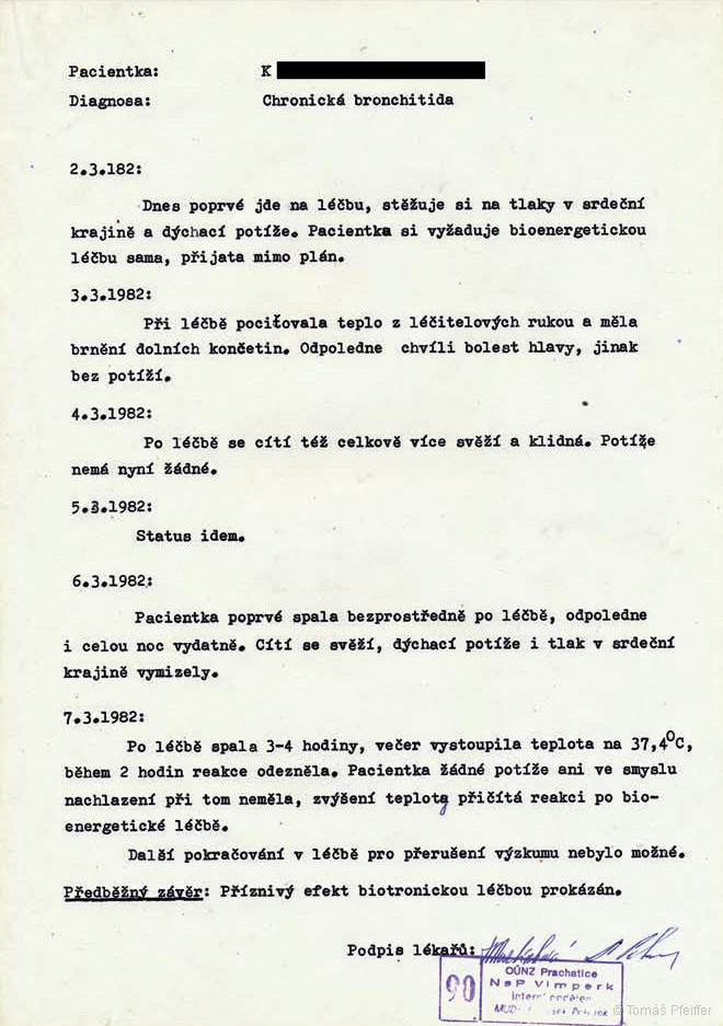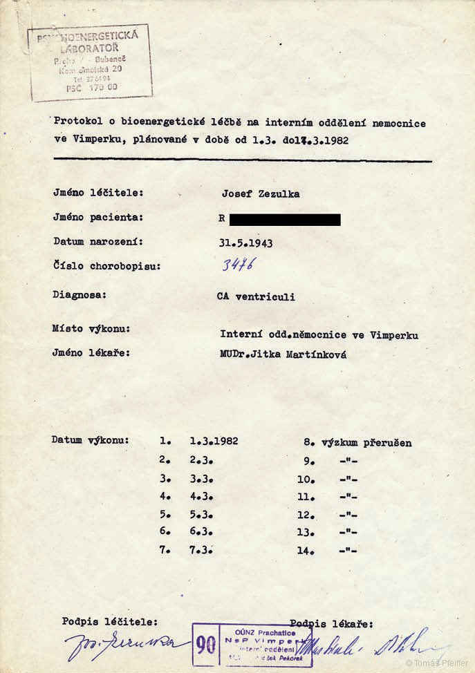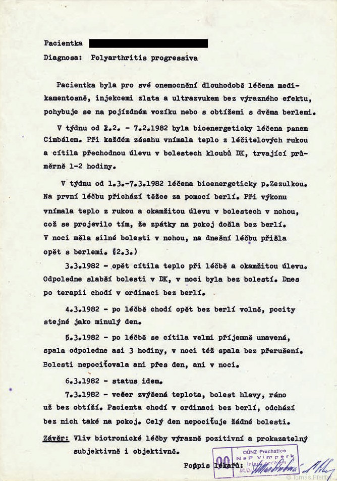Zvláště na jednoho pacienta léčeného panem J. Z. se sjížděli podívat lékaři z okolí, dokonce i porodníci. A bylo proč. Jak uvidíte ze zápisu, pořízeného tehdy a podepsaného lékařem vimperské nemocnice MUDr. Pekárkem a MUDr. Martínkovou za psychoenergetickou laboratoř, která výzkum z osobního pověření profesorem Kahudou vedla.